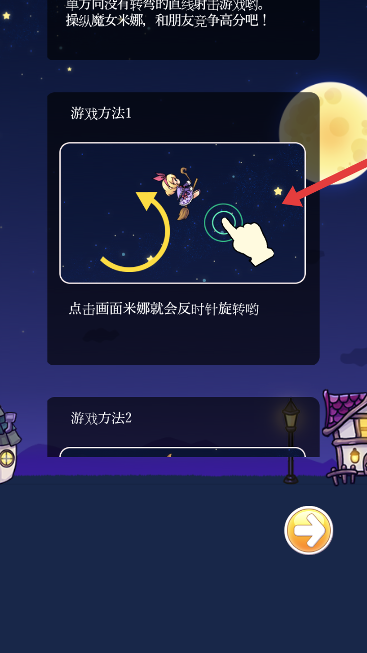 2、查看游戲的方法說明,需要了解到點(diǎn)擊畫面,魔女米娜會(huì)逆時(shí)針旋轉(zhuǎn),通過此操作進(jìn)行游戲。
