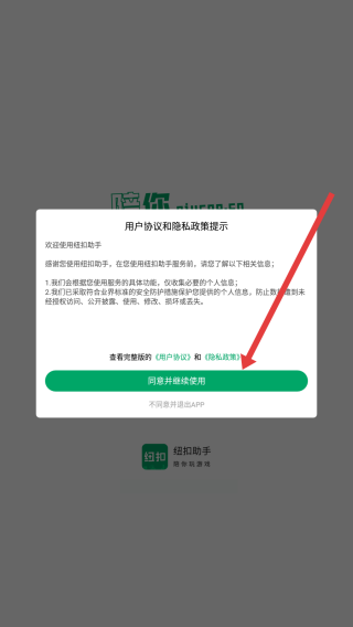 1、打開(kāi)紐扣助手,彈出用戶協(xié)議和隱私政策提示彈窗,點(diǎn)擊綠色同意并繼續(xù)使用按鈕,接受條款進(jìn)入應(yīng)用。