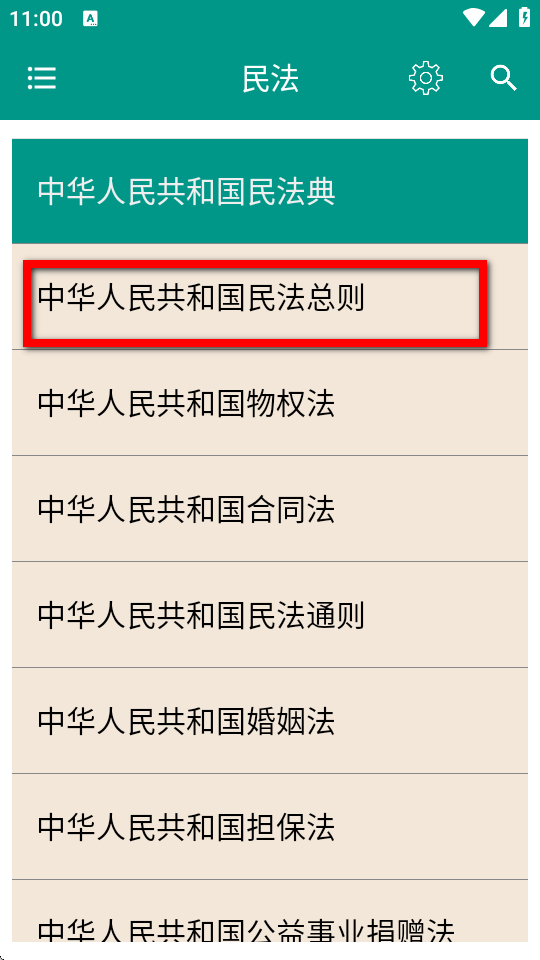 3、在民法分類頁面,點(diǎn)擊中華人民共和國(guó)民法總則等具體法律條目。