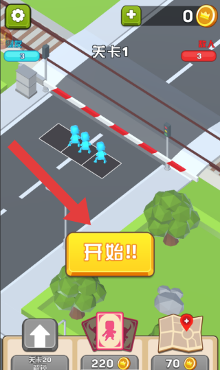 1、畫面上方顯示關(guān)卡1,根據(jù)提示【開始】按鈕,點擊后應(yīng)進(jìn)入關(guān)卡戰(zhàn)斗,代表游戲內(nèi)資源或單位數(shù)量。