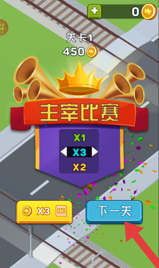 3、用于選擇獎勵倍數(shù),背景中的道路、鐵軌元素及彩色紙屑,營造出勝利慶祝的氛圍,表明玩家完成當(dāng)前關(guān)卡并可選擇獲取獎勵或繼續(xù)游戲。