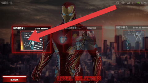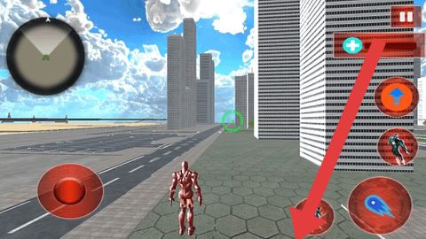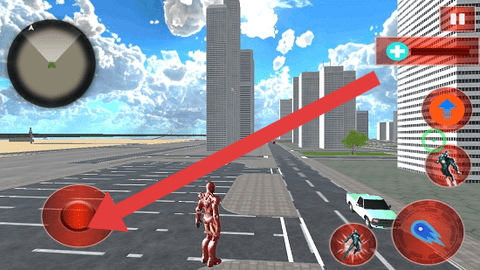 1、在游戲主界面(如第一張圖),點(diǎn)擊左側(cè)紅色圓形移動(dòng)按鈕(箭頭指向),操控鋼鐵俠角色在城市街道移動(dòng),熟悉基礎(chǔ)操作。