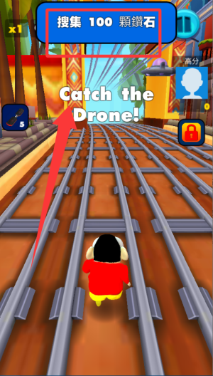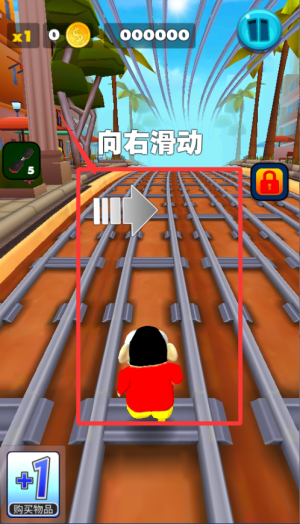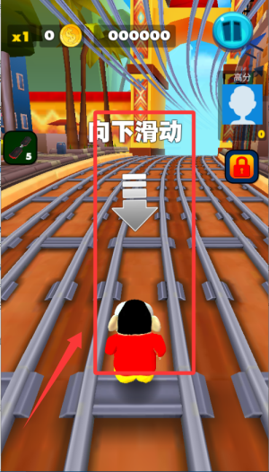 1、游戲開始后滑動屏幕控制小新左右移動,避開障礙物。注意收集金幣和道具,金幣可用來購買新角色和裝扮。