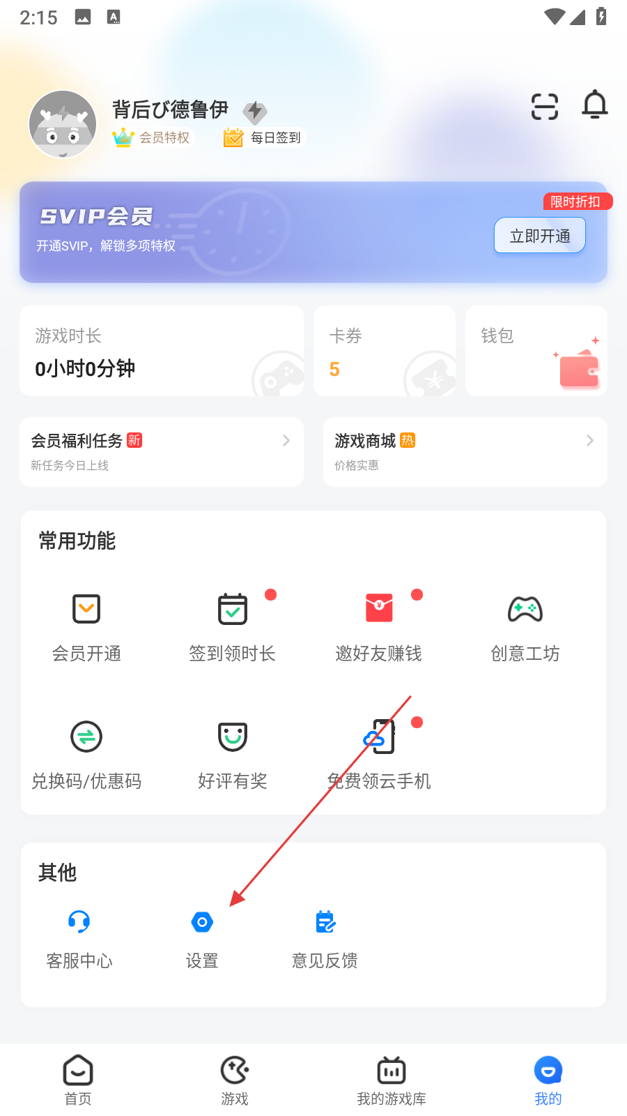 1、打開(kāi)云電腦應(yīng)用,點(diǎn)擊底部導(dǎo)航欄中我的選項(xiàng),進(jìn)入個(gè)人中心頁(yè)面,在常用功能下方找到并點(diǎn)擊設(shè)置選項(xiàng)。