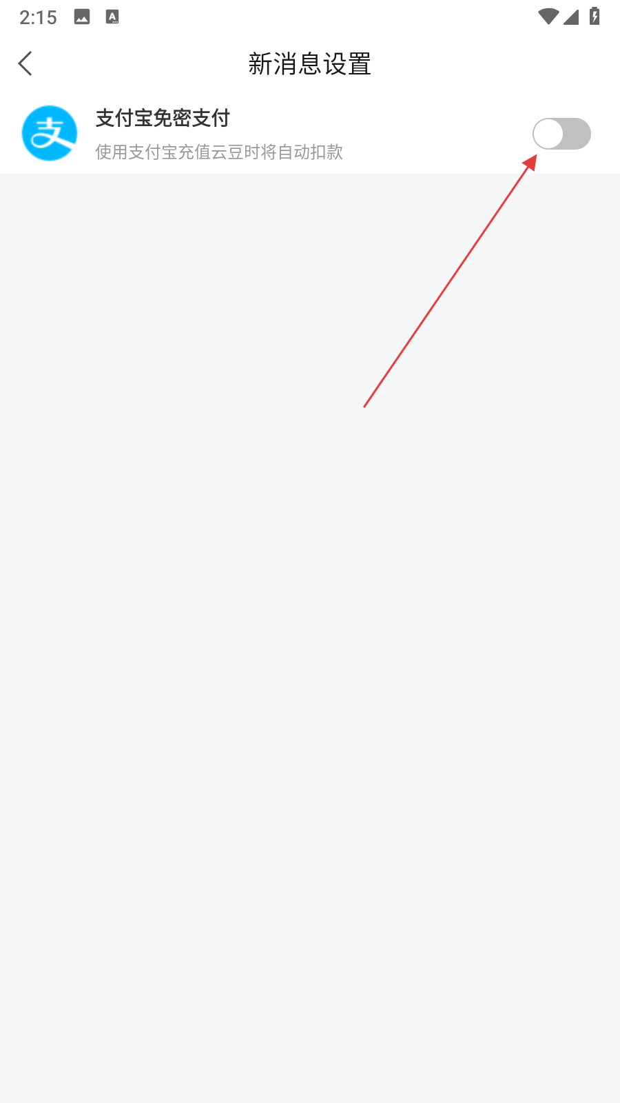 3、在免密支付設(shè)置界面,找到想要開(kāi)啟免密支付的方式,比如支付寶免密支付,點(diǎn)擊其右側(cè)的開(kāi)關(guān)按鈕將其開(kāi)啟,開(kāi)啟后使用對(duì)應(yīng)方式充值云豆時(shí)將自動(dòng)扣款。