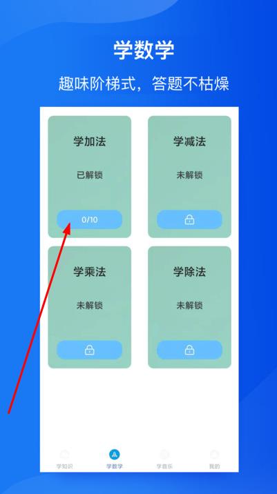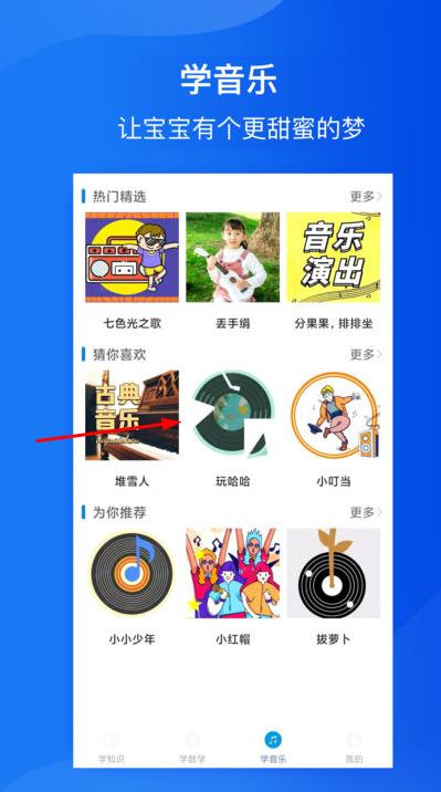 1、打開應(yīng)用進(jìn)入主界面,孩子可看到猜歌、學(xué)百科、學(xué)數(shù)學(xué)三大模塊,點擊對應(yīng)圖標(biāo)即可進(jìn)入喜歡的學(xué)習(xí)場景。