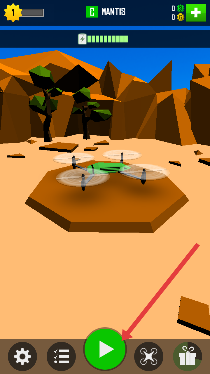 1、進(jìn)入無人機賽車峽谷的游戲界面后,點擊底部中間的【綠色播放按鈕】,開啟無人機競速之旅。