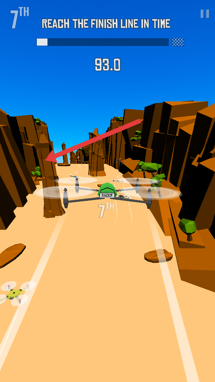 2、在賽道中依據(jù)提示,操控?zé)o人機在峽谷間前進(jìn),注意避開兩側(cè)巖石,保持速度(如93.0),提升排名。