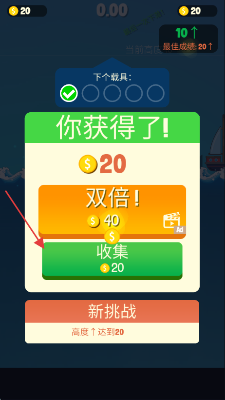 2、游戲中留意上方數(shù)值變化,關(guān)注高度或進(jìn)度,避開障礙推進(jìn)游戲。