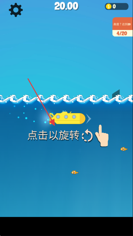 1、進(jìn)入游戲后,按照提示【點擊以旋轉(zhuǎn)】操控黃色潛水艇,調(diào)整方向開始游戲。