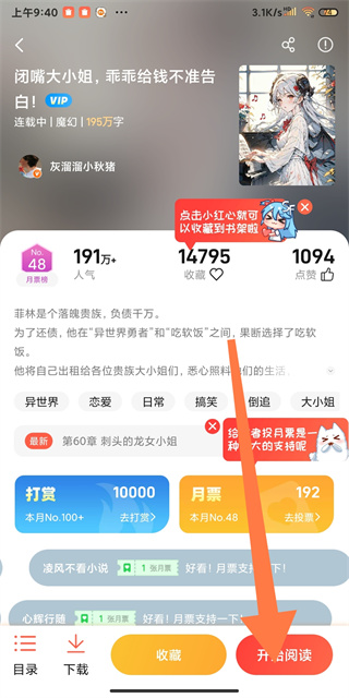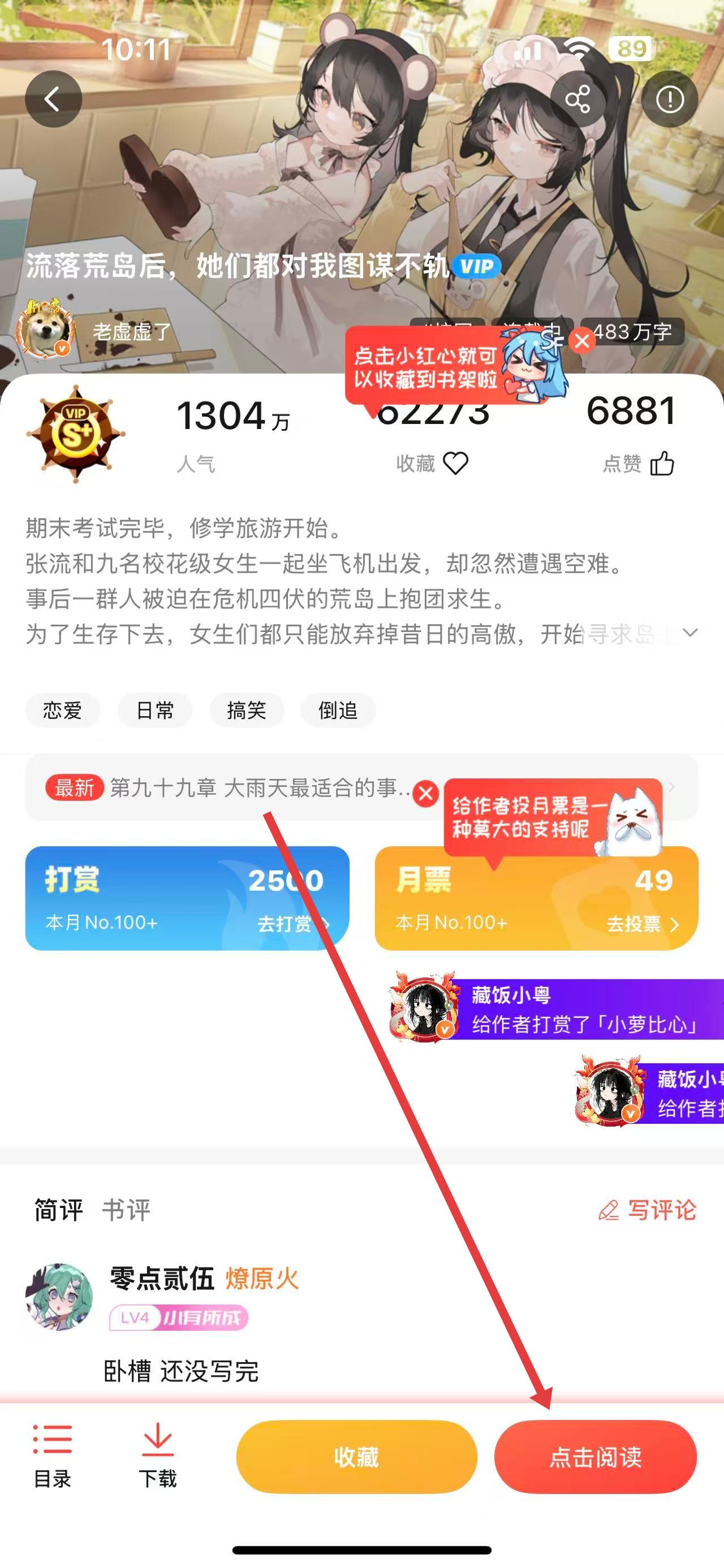 2、在作品詳情頁面,點擊點擊閱讀按鈕,進(jìn)入小說閱讀界面。