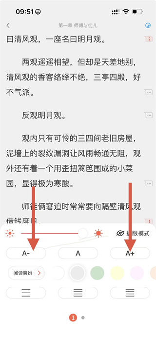4、在閱讀設(shè)置界面,點擊A-或A+按鈕,即可調(diào)整字體大小完成字體修改操作。