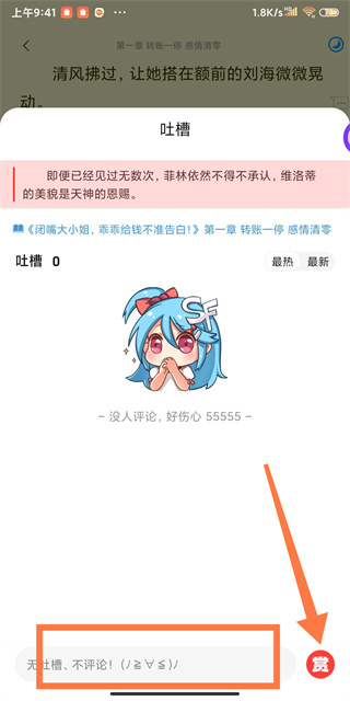 3、在小說閱讀界面,點擊右側(cè)彈幕圖標(biāo),彈出彈幕輸入框。