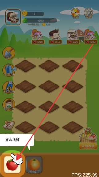 1、進入游戲,看到提示【點擊播種】,點擊下方種子圖標,在田地里播種果樹,開啟種植之旅,積累種植經(jīng)驗。