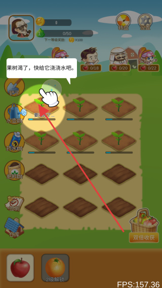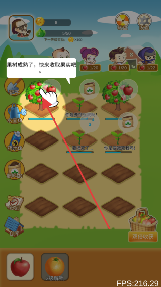 3、果樹成熟時,按提示【果樹成熟了,快來收取果實吧!】,點擊成熟果樹收獲果實,可點擊【雙倍收獲】獲取更多獎勵,提升游戲收益。