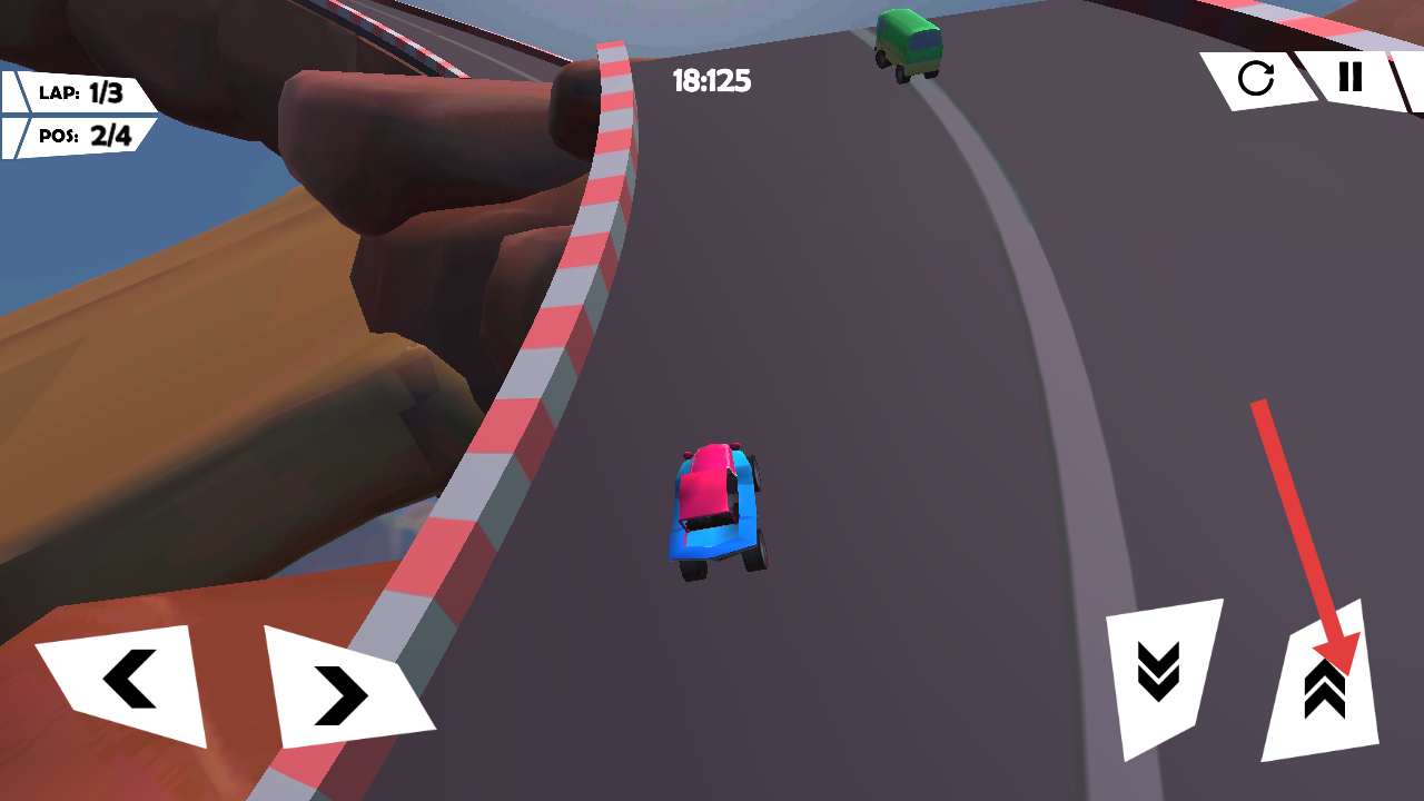 3、游戲中點(diǎn)擊屏幕右下角向上箭頭按鈕加速前進(jìn),努力提升排名,按提示完成比賽圈數(shù)。