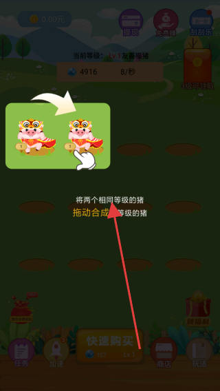 2、依據(jù)提示【將兩個(gè)相同等級(jí)的豬拖動(dòng)合成更高級(jí)的豬】,拖動(dòng)相同等級(jí)小豬進(jìn)行合成,提升豬的等級(jí)(如從Lv1升為L(zhǎng)v3),增加收益。