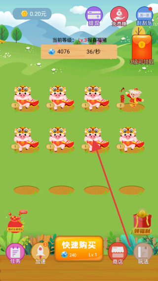 3、持續(xù)合成小豬,提高豬的等級(jí)(如Lv3報(bào)喜豬豬),增加每秒收益(如36/秒),可按需使用【快速購(gòu)買】等功能,加速養(yǎng)豬進(jìn)程。