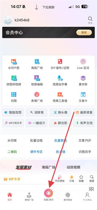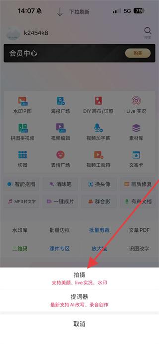 1、打開微脈水印相機(jī)APP,點(diǎn)擊底部拍攝/提詞,彈出功能選項。