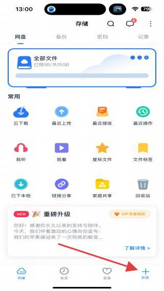1、打開115生活A(yù)PP,進(jìn)入到首頁內(nèi),點(diǎn)擊右下角新建的圖標(biāo)。