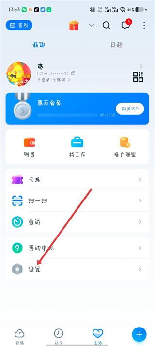 1、打開115網(wǎng)盤APP,進(jìn)入我的頁面,點(diǎn)擊設(shè)置選項(xiàng)。