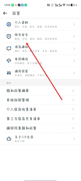 2、在設(shè)置頁面點(diǎn)擊賬號(hào)安全選項(xiàng),進(jìn)入賬號(hào)安全頁面。