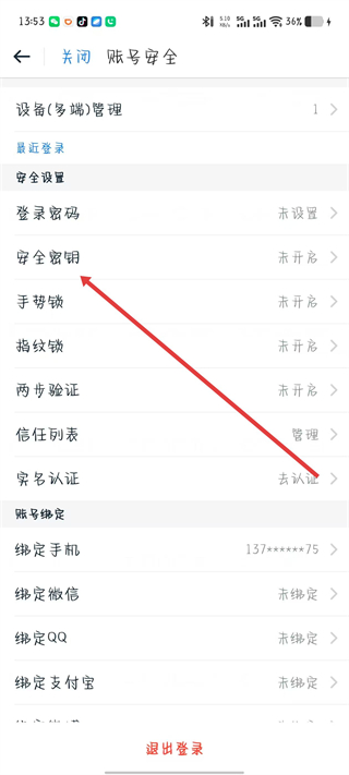 3、在賬號(hào)安全頁面點(diǎn)擊安全密鑰,進(jìn)入安全密鑰頁面。