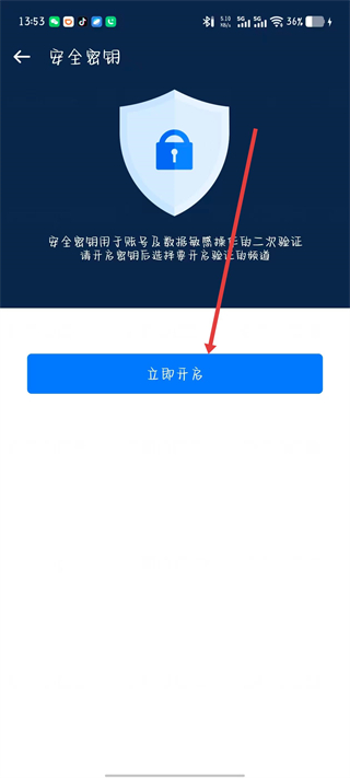 4、在安全密鑰頁面點(diǎn)擊立即開啟,按照提示完成流程即可。
