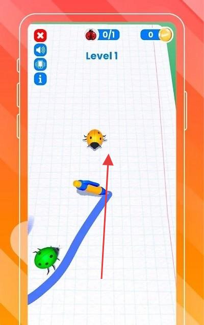 1、基礎(chǔ)操作:點擊屏幕開始繪制線條,滑動手指控制線條方向,松開手指結(jié)束繪制,線條必須形成封閉圖形才能成功捕捉蟲子。