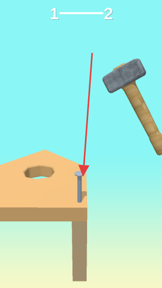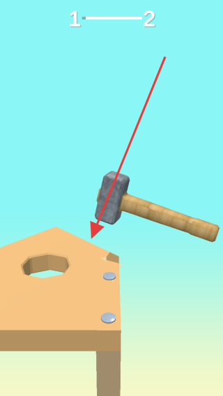 1、進入游戲關(guān)卡,觀察到桌上的釘子,按箭頭指示操作錘子,精準敲擊釘子,使其釘入木板。
