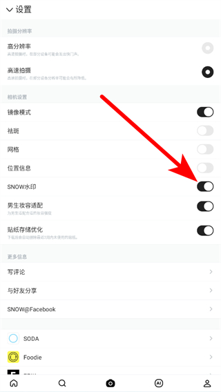 4、在設(shè)置界面中找到SNOW水印開關(guān),可根據(jù)需求開啟或關(guān)閉水印。
