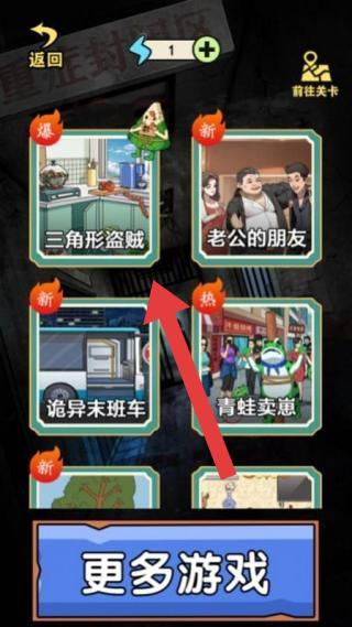1、包含多個關(guān)卡選項,部分關(guān)卡標(biāo)有標(biāo)簽,底部有更多游戲按鈕,整體呈現(xiàn)出一個多關(guān)卡集合的選擇界面,是一款包含多種劇情或解謎元素的休閑。