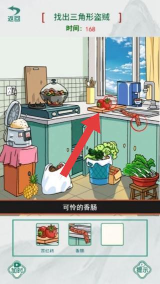 2、任務(wù)為【找出三角形盜賊】,畫面呈現(xiàn)廚房場景,有電飯煲、灶臺、蔬菜等元素,體現(xiàn)了通過在特定場景中尋找目標(biāo)物品來推進(jìn)關(guān)卡的玩法。