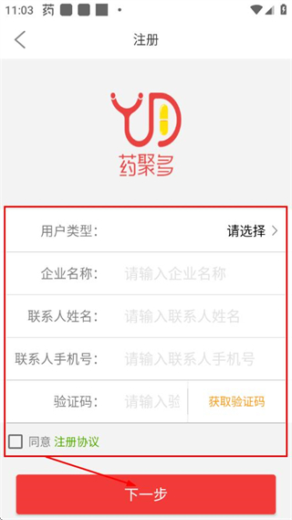 2、選擇用戶類型,填寫企業(yè)名稱、聯(lián)系人姓名、手機(jī)號(hào),驗(yàn)證碼,勾選注冊(cè)協(xié)議,點(diǎn)擊下一步。