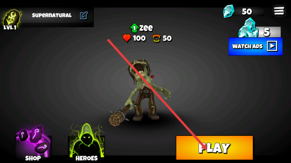 2、在角色界面,查看角色屬性(如Zee的血量100、攻擊力50),點擊【PLAY】開始游戲,進入戰(zhàn)斗模式。