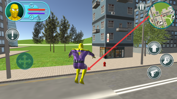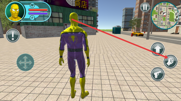 2、在游戲場景中,利用右側的操作按鈕(如手勢圖標),操控蜘蛛英雄角色移動,探索城市環(huán)境,完成任務。