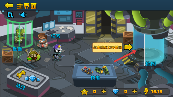 2、在主界面中點擊箭頭所指的“地圖”區(qū)域,開啟游戲地圖,選擇關(guān)卡。