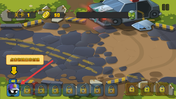 3、進(jìn)入關(guān)卡1后,點擊箭頭所指的火柴人頭像,創(chuàng)建火柴人角色,開始抵御僵尸進(jìn)攻。