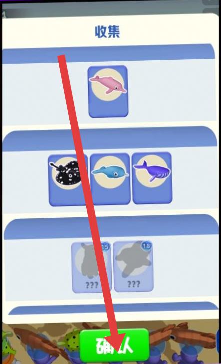 2、進(jìn)入收集界面,查看已收集的魚(yú)類(如粉色海豚等),點(diǎn)擊【確認(rèn)】按鈕,完成收集操作,記錄成果。