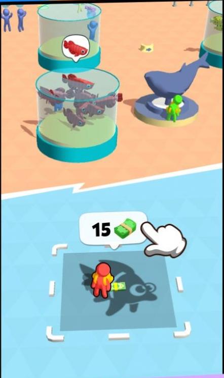 3、在游戲場(chǎng)景中,按照提示(如手指指向的15金幣),進(jìn)行相關(guān)操作(如放置魚(yú)類到展示區(qū)),獲取金幣獎(jiǎng)勵(lì)。