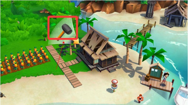 1、在出現(xiàn)圖示的“錘子”時(shí),拖動(dòng)其至破損的房屋上,進(jìn)行重建。