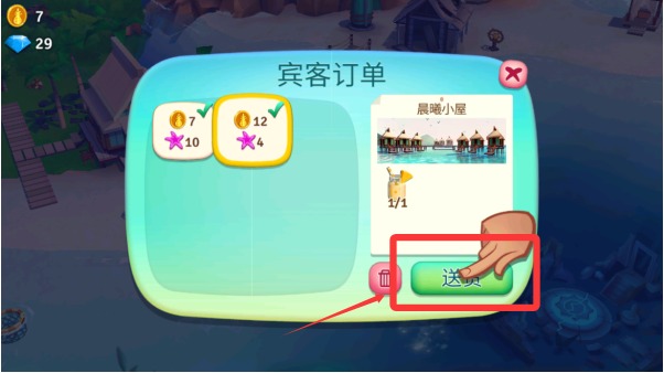 3、岸邊告示板可以查看賓客訂單,當(dāng)你擁有客戶所需物資時(shí),點(diǎn)擊“送貨”開始運(yùn)輸。
