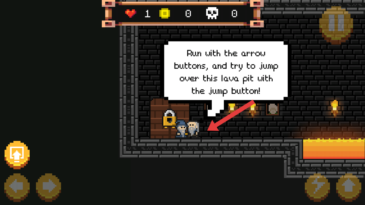 2、根據(jù)提示使用箭頭按鈕移動(dòng)角色,遇到熔巖坑時(shí)用跳躍按鈕跳過(guò),熟悉基本操作,完成新手引導(dǎo)。