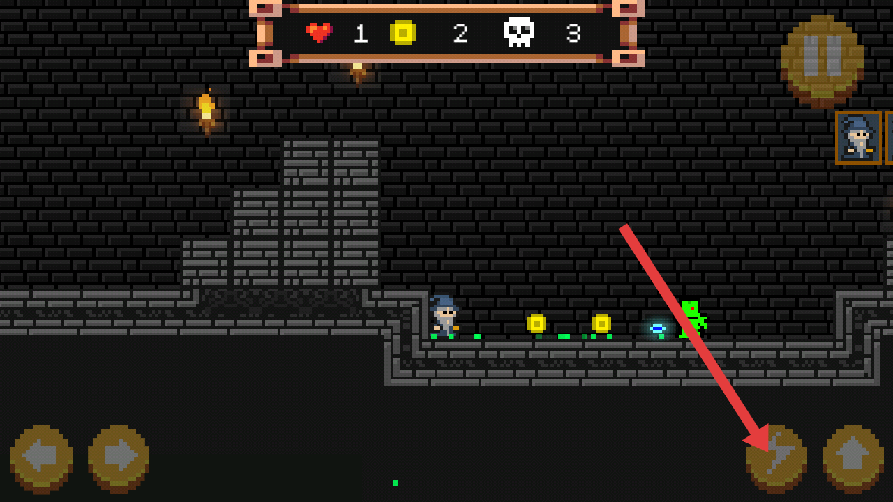 3、在游戲場(chǎng)景中,操控角色收集金幣,遇到綠色敵人時(shí),點(diǎn)擊右下角攻擊按鈕進(jìn)行攻擊,消滅敵人并推進(jìn)關(guān)卡。
