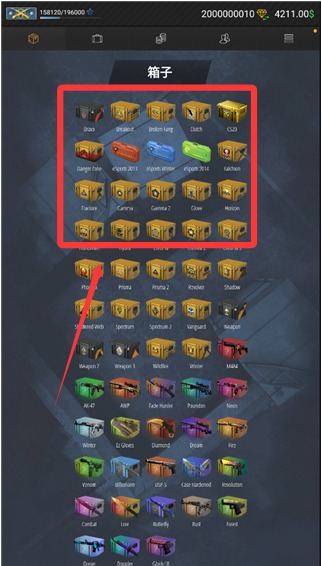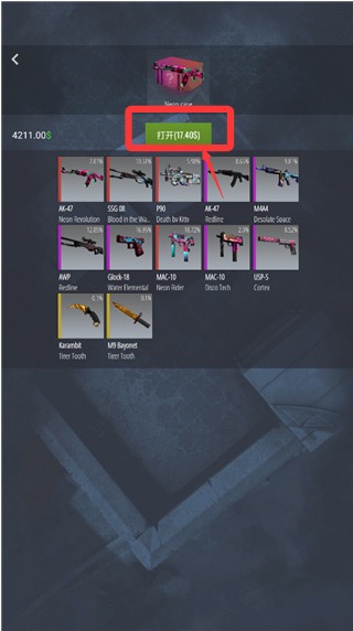 1、在主界面挑選心儀的箱子進(jìn)入開(kāi)箱流程,動(dòng)效真實(shí)模擬CS:GO原版開(kāi)箱動(dòng)畫(huà),武器圖標(biāo)滾動(dòng)、光效變化一氣呵成,令每次開(kāi)啟都充滿(mǎn)期待。