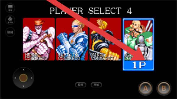 2、進(jìn)入角色選擇界面(PLAYERSELECT4),選擇1P角色(如藍(lán)色框選角色),點(diǎn)擊開始,進(jìn)入游戲關(guān)卡。