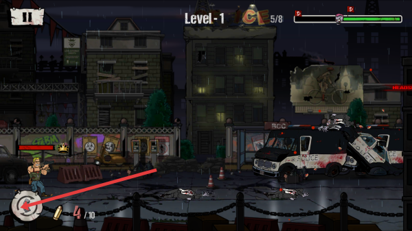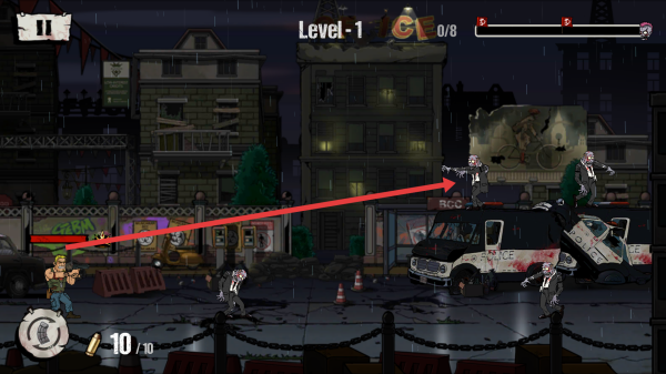 1、進入Level-1關卡,操控角色瞄準右側僵尸,利用武器射擊(初始彈藥10/10),消滅僵尸推進游戲進程。