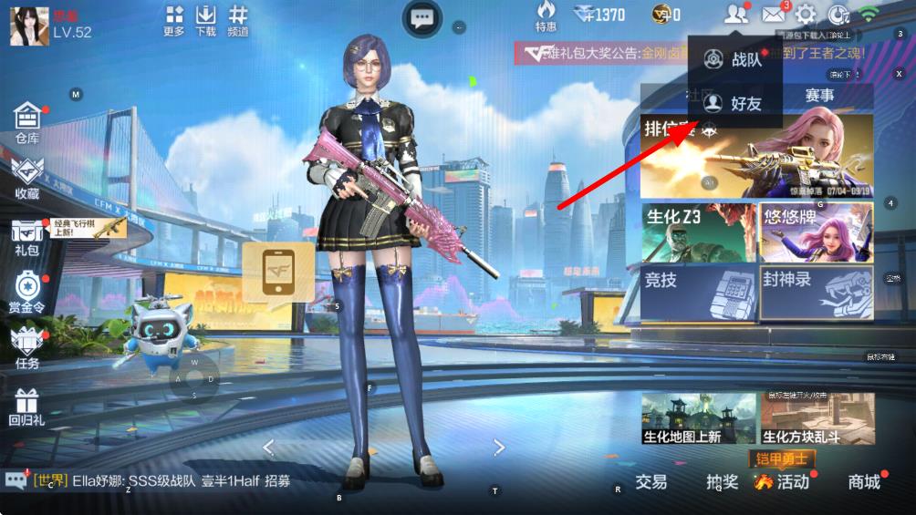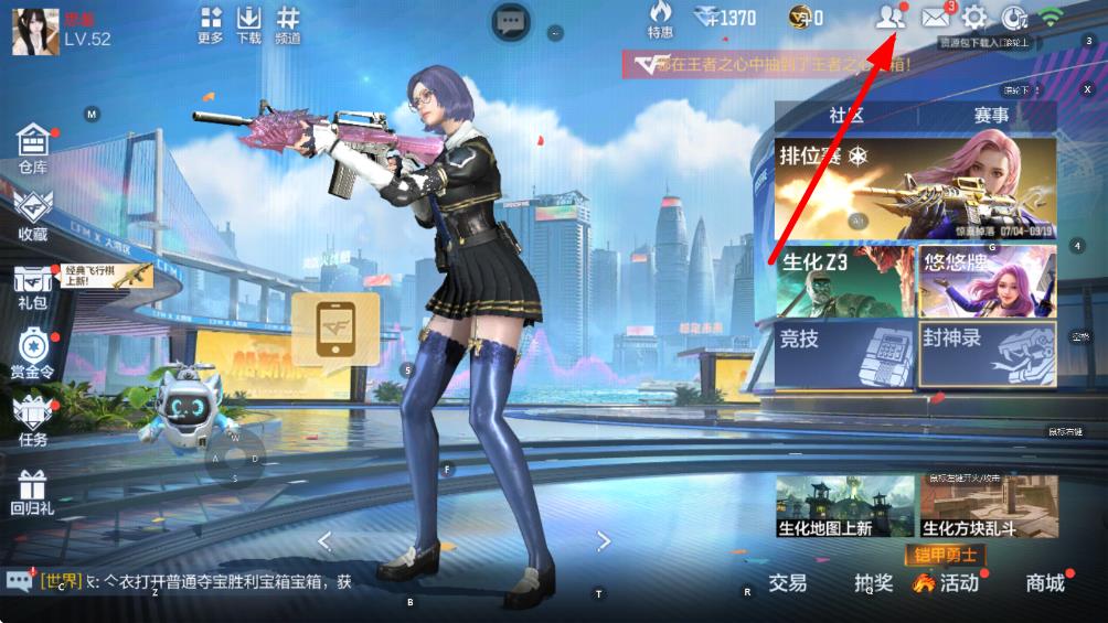 1、打開穿越火線游戲,在游戲主界面中,點(diǎn)擊屏幕右上方的好友圖標(biāo)。