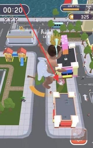 2、游戲中角色在城市上空飛行,通過移動操控(如箭頭指引方向),收集場景中的物品(如粉色花朵圖標(biāo))。
