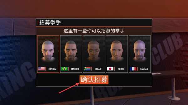 1、在招募拳手界面,查看可招募的拳手如DAMIREZ、MARINO等,點擊確認招募選定拳手。
